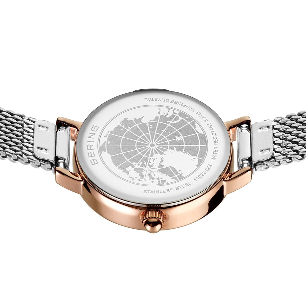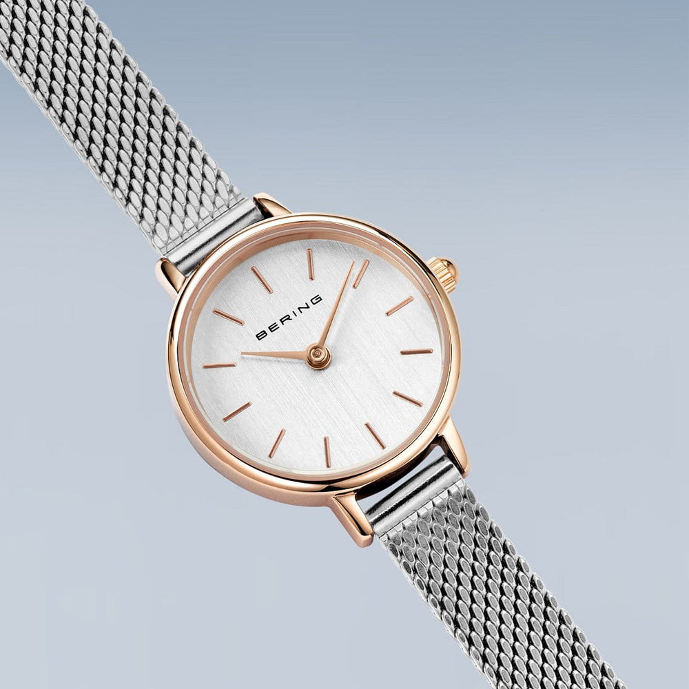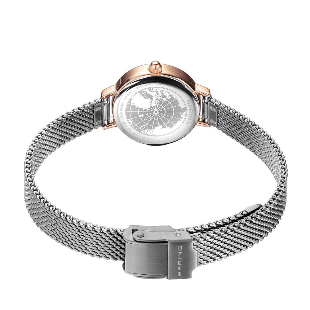 With a diameter of just 22 mm and a height of 6 mm, the case appears especially delicate and sits lightly and comfortably on the wrist. The silver Milanese strap adds a modern touch and ensures a secure, comfortable fit thanks to the fold-over clasp.