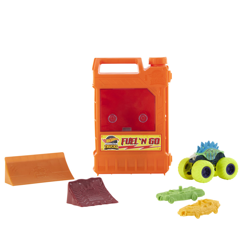 The Hot Wheels Monster Trucks Fuel N' Go Playset Hits The Gas On Smashing And Crashing! The Set Is Shaped Like A Gas Can With A Window Display To Show Off The Included 1:64 Scale Hot Wheels Monster Trucks Motosaurus. Open The Container To Reveal A Mini-Stunting Arena With A Ramp And Two Crushable Cars. There's Also A Repair Area Where Kids Can Drive Motosaurus Onto The Lift To Perform Any Necessary Repairs, Then Launch Back Into Action. The Fuel Can Doubles As A Cool Storage Container And Makes It Easy To Stunt On The Go! Ideal For Kids 4 Years Old And Up. Colors And Decorations May Vary.