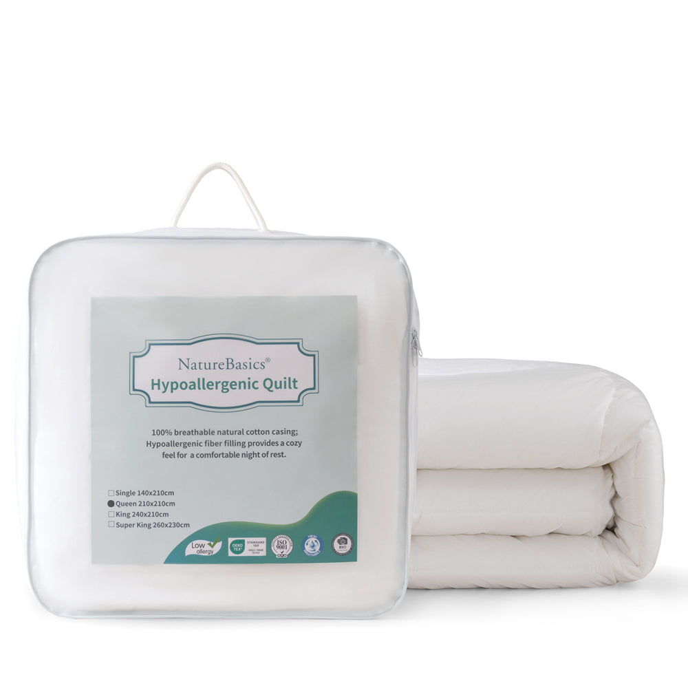 Nature Basics Hypoallergenic Quilt is suitable for those who want a light summer quilt which is fluffy, providing the luxurious hotel feel. Ideal for use in room of temperature 18-24°C. Nature Basics Hypoallergenic Quilt has 100% breathable natural cotton casing with hypoallergenic fiber filling providing a cozy feel for a comfortable night of rest. A comfortable quilt which is smooth to the touch, has delicate craftsmanship, washable and long lasting quality product.