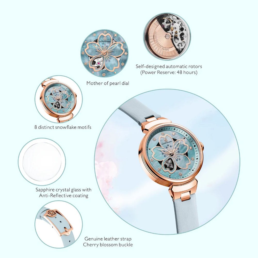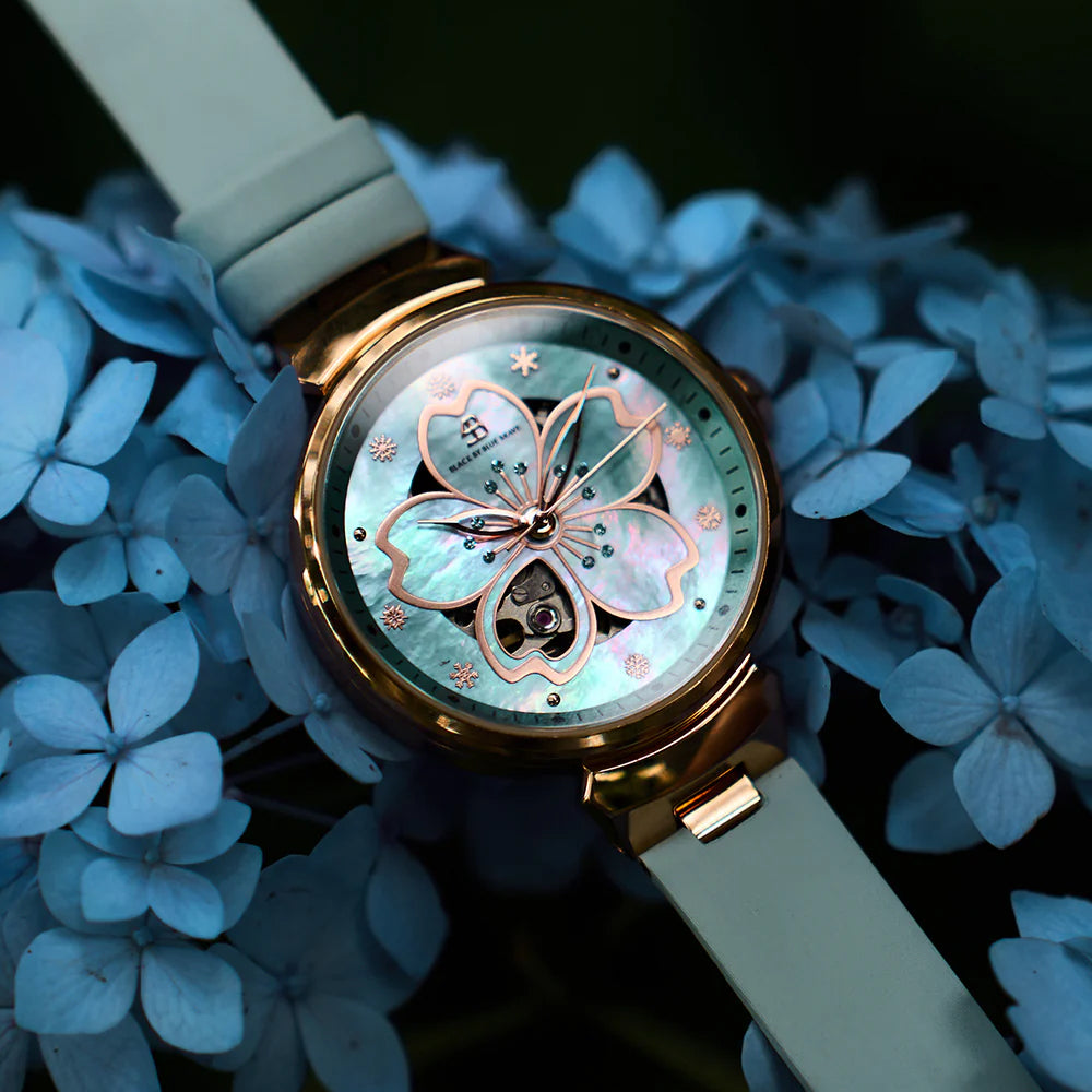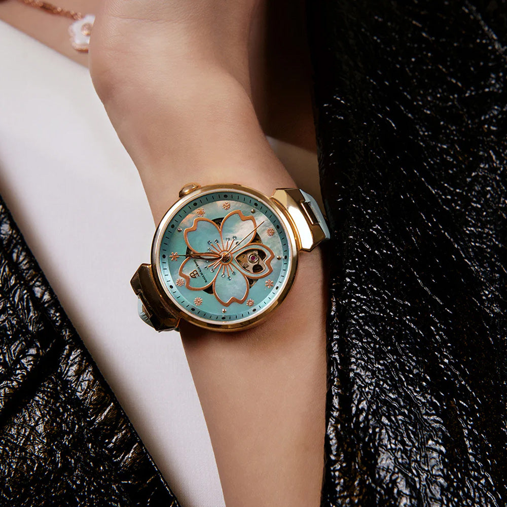 In the center of the cherry blue mother-of-pearl dial, the five-petal cherry-shaped hands move with the flow of time, as agile as the first blooming cherry blossoms. The hollow petals in the lower left corner cleverly reveal the rhythm of the mechanical movement, and the precise operation of the gears and balance wheel is looming, adding a touch of mechanical aesthetics to the elegant dial.