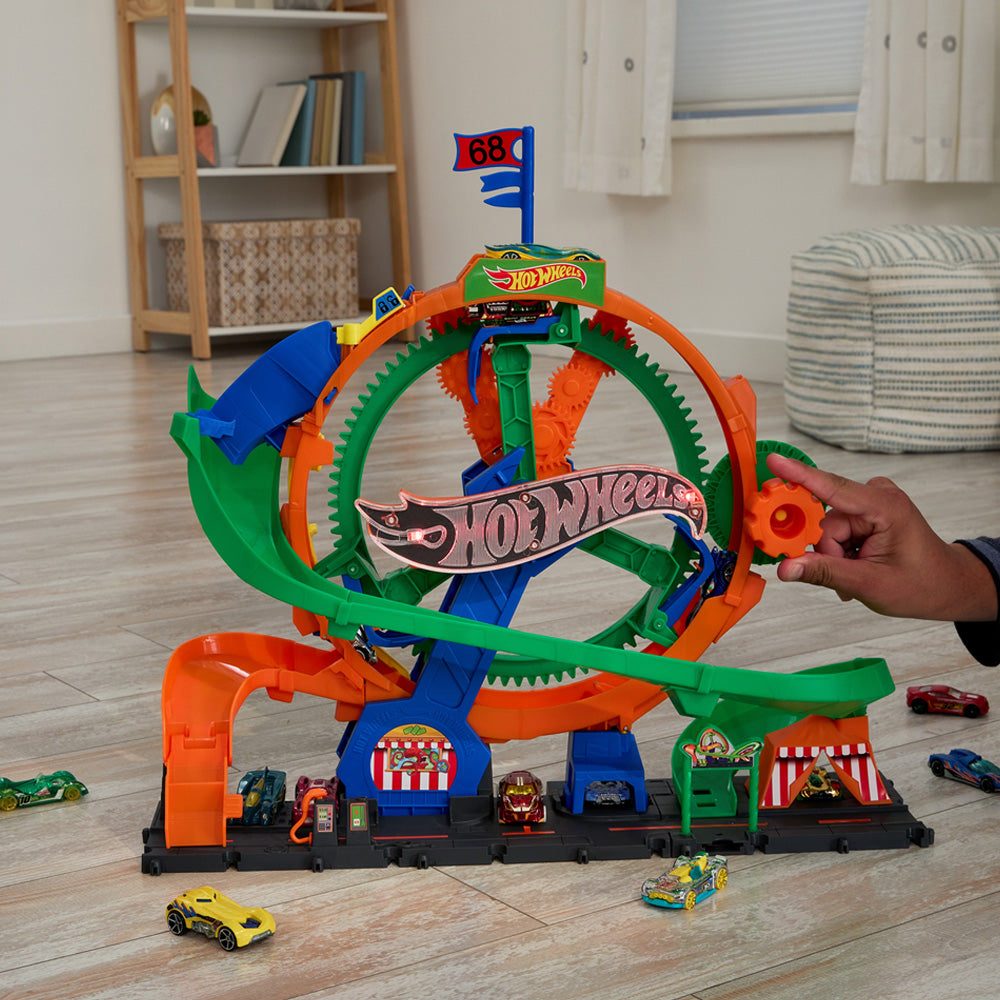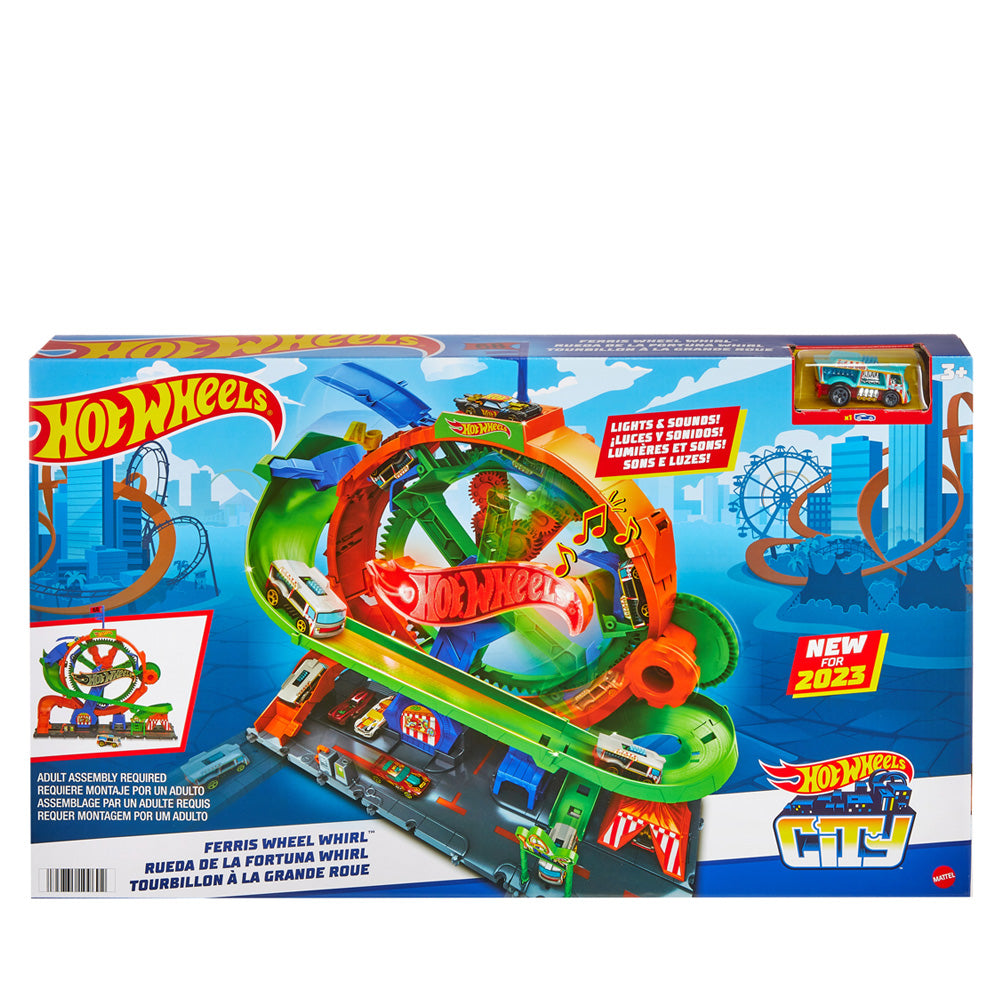 • Take a whirl on the Hot Wheels City Ferris Wheel Whirl playset that includes kid-activated features, imaginative track play and lights and sounds.
