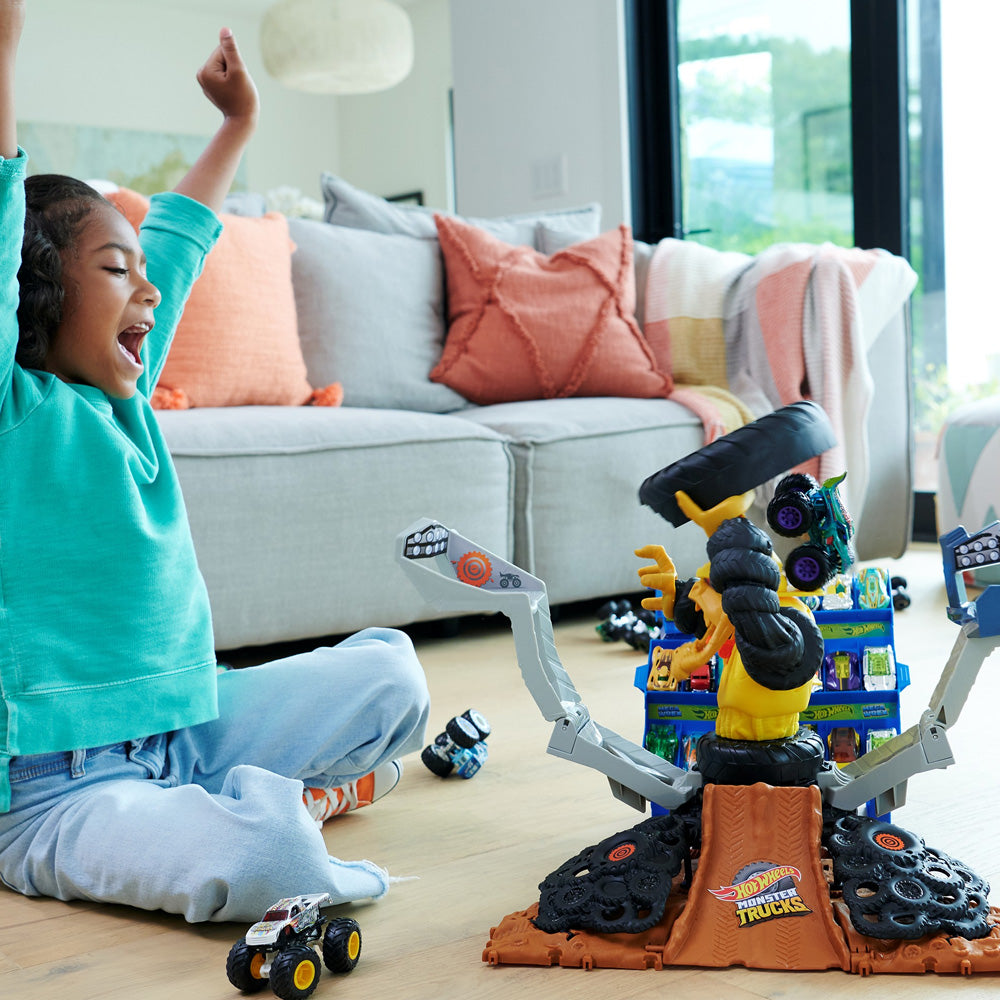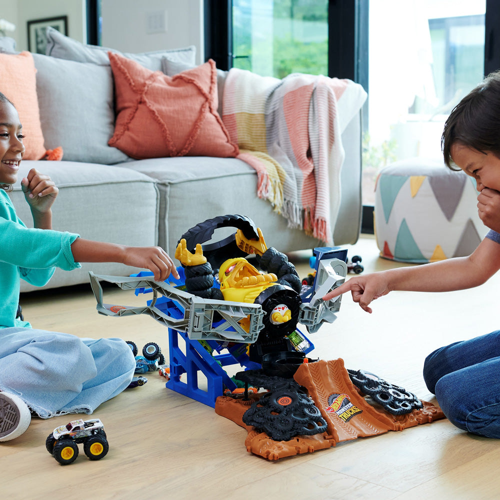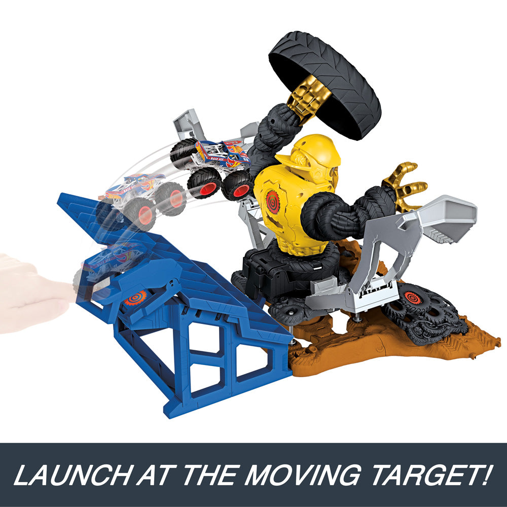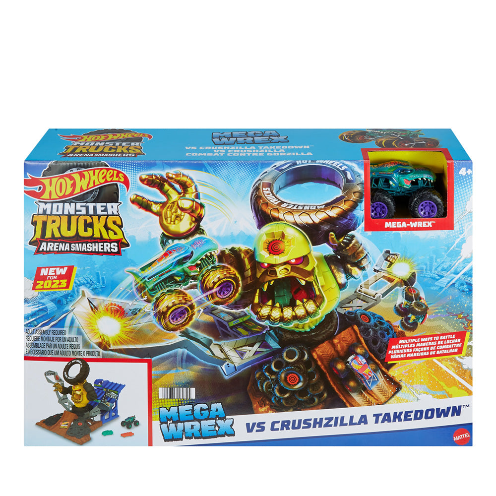 • In the Hot Wheels Monster Trucks Arena Smashers Mega-Wrex vs. Crushzilla Takedown playset, kids drive and launch Mega-Wrex at a spinning and pivoting Crushzilla to knock him out and win the challenge!