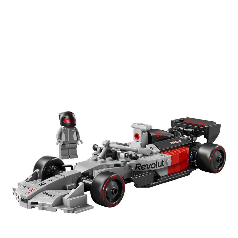This Audi Revolut F1® Team R26 Race Car toy features a cockpit, rear wing, authentic sponsor logos, front wheel suspension and tires imprinted with “Pirelli.” The toy vehicle also comes with a minifigure in an Audi Revolut F1® Team outfit and a helmet to place inside the cockpit and stage races.