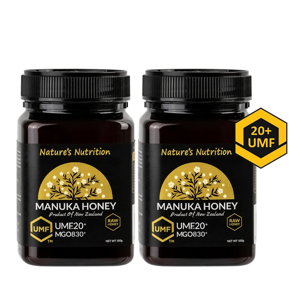UMF 20+ – Contains MGO 829+. MGO stands for Methylglyoxal and it is a naturally occurring compound found in the Manuka honey which is responsible for its antibacterial properties. The higher the UMF number, the higher the MGO content and the more antibacterial strength the honey has.