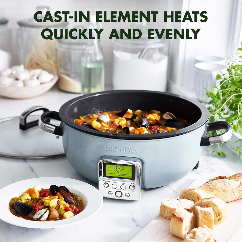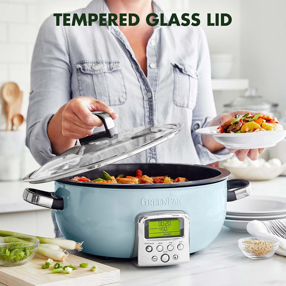 LCD screen with digital control panel and various cooking program modes: sear/sauté, stir-fry, sauce, simmer, steam, white rice, brown rice, grains, soup, warm