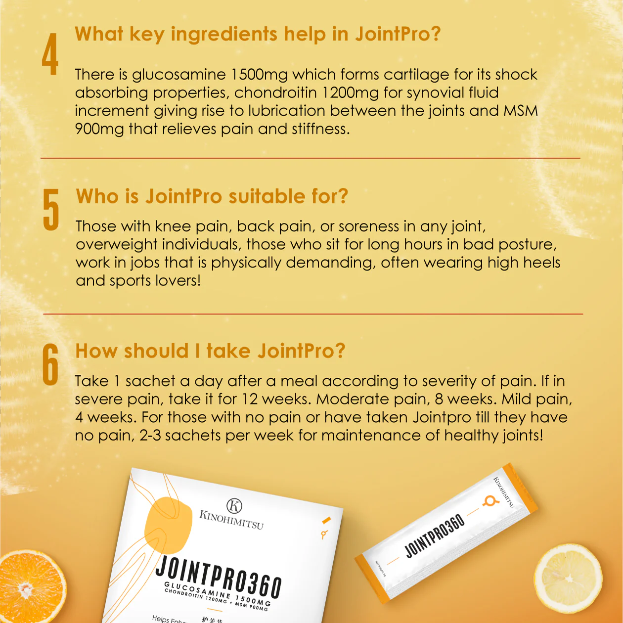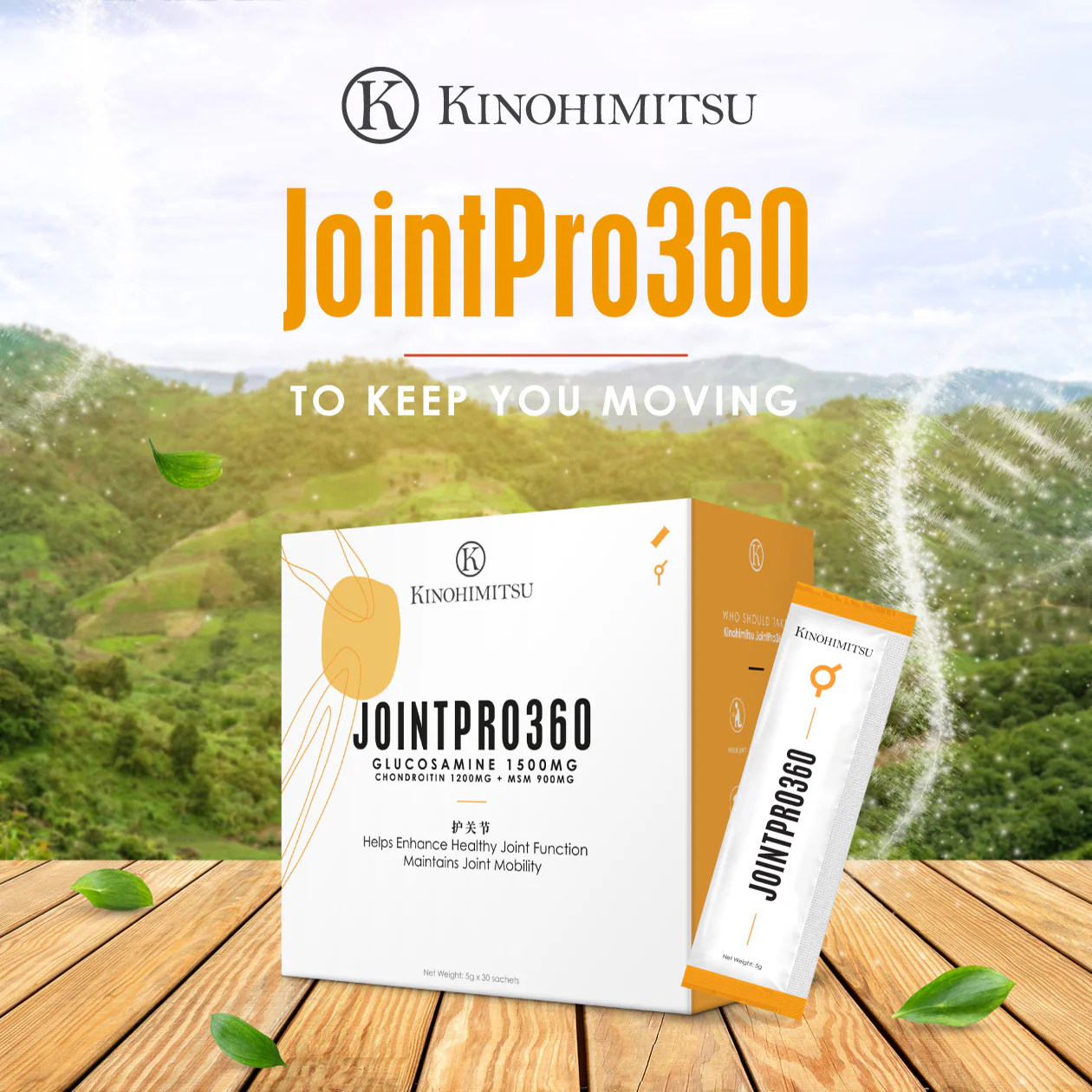 Kinohimitsu JointPro360 is a high strength formulation containing Glucosamine Hydrochloride 1500mg, Chondroitin 1200mg and MSM 900mg in just one single consumption. It works to support healthy joints and cartilage. It also helps promote flexibility to let you enjoy the exercises and activities you love.