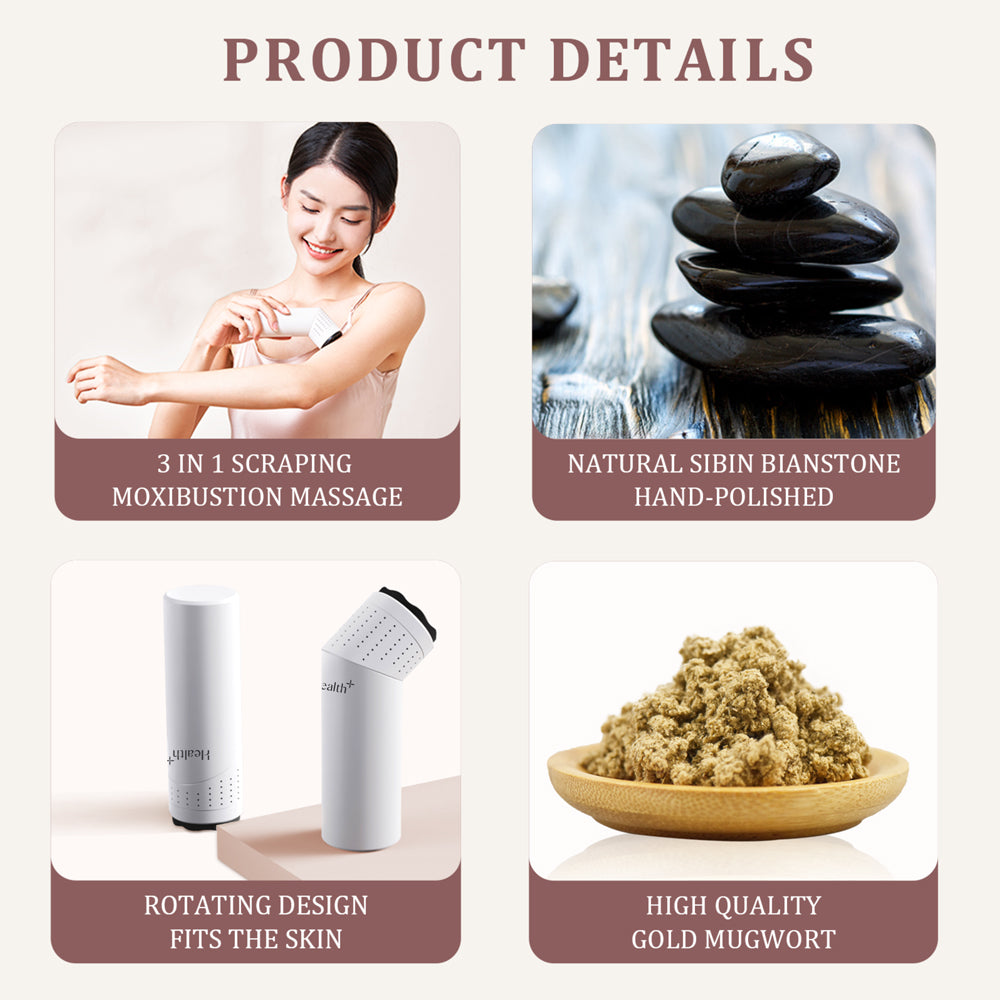 The Health+ Gua Sha Wand is specially selected Sibin Bian Stone, releasing abundant micro-energy elements known for their healing properties. This wand goes beyond traditional practices, addressing common discomforts like cold extremities, lower back pain, and fatigue. It is facilitated by the 12 protruding warm and smooth Bian Stones that produce the therapeutic “sha '' in just 60 seconds. The mugwand used in the wand, carefully stored for three years ensures a warm application without dryness.