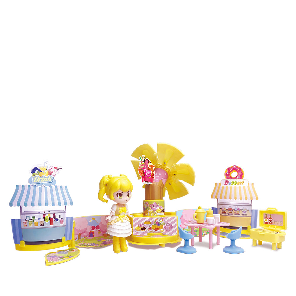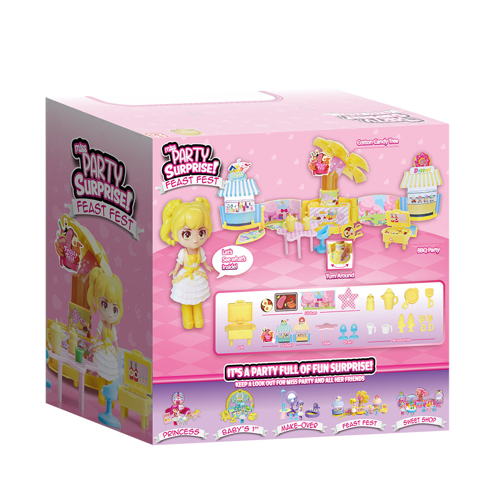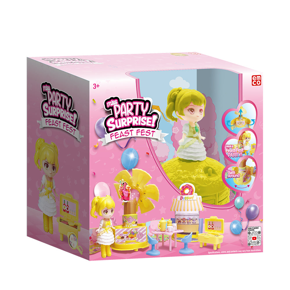 The Miss Party Surprise, Feast Fest Set Is A Toy With A Food-Themed Playset And A Surprise Doll. It Is Part Of The Larger Emco Miss Party Surprise Collection, Which Features Dolls With Large Plastic Skirts That Open Up To Reveal Themed Playsets.