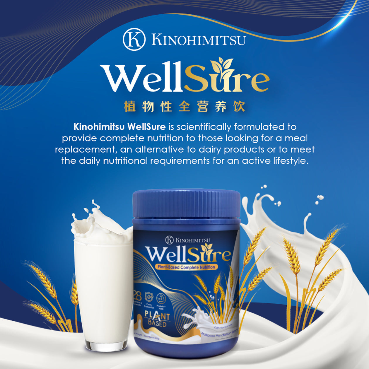 Kinohimitsu WellSure is specially formulated with plant-based proteins from Soy, Pea, Quinoa and Rice while enriching with HMB plus 28 types vitamins and minerals to build your nutritional foundation for an active lifestyle. It is a wholesome oral nutritional formula designed scientifically as dairy alternative to complete your daily meal nutrition need while providing you strength and vitality!