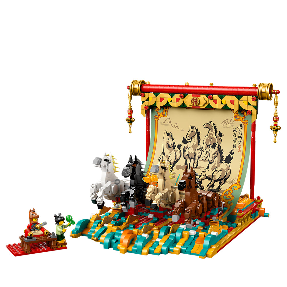 Hang the canvas with a printed brush painting of 4 galloping horses – which symbolizes the traditional blessing of ‘success upon arrival’ in the New Year – as a backdrop to your model. Pose the legs of the 4 brick-built horse toys and turn the handle to make the horses move as if galloping out of the painting. Horses are a symbol of strength and the total number of 8 depicted in the painting/model symbolizes good fortune.