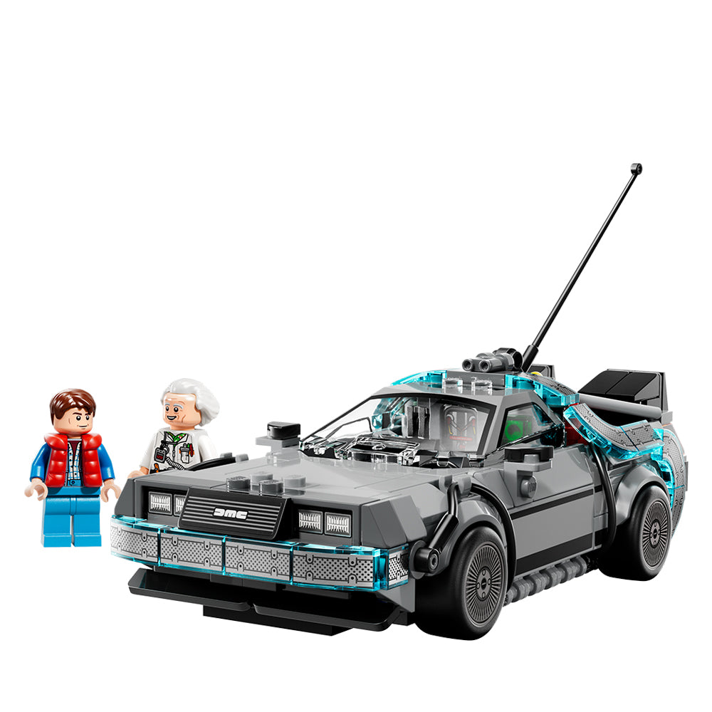 Build this iconic car with a lightning rod and California license plate from the first movie before rebuilding it into its flying version from the second movie with Mr. Fusion, an orange license plate and sideways wheels. Both versions have rear air vents, a cockpit, the flux capacitor and time calculator.