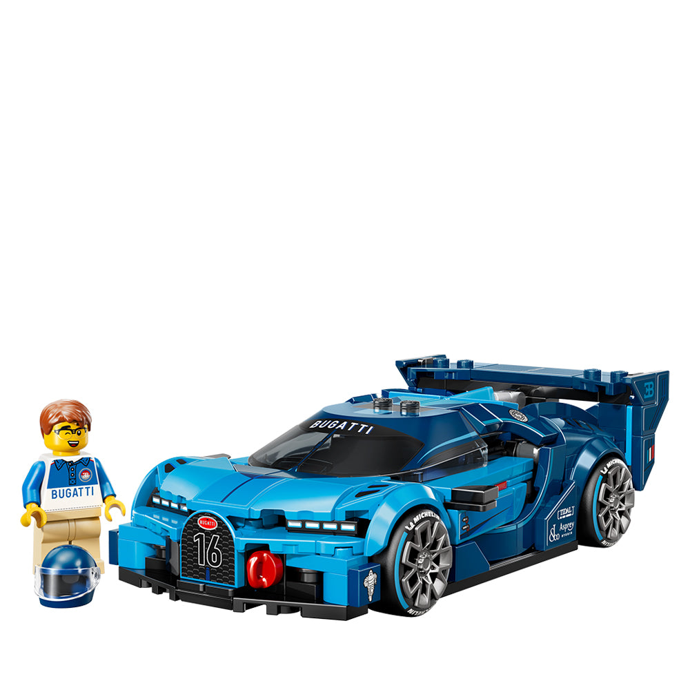 This Bugatti model car Includes details from from the car created by Bugatti for the Gran Turismo video game in 2015. This includes a horseshoe front grille, rear wing, distinctive 8-eye headlights, a roof fin and wide tires imprinted with ‘Michelin’. The car toy also includes a minifigure wearing a Bugatti outfit to place inside the cockpit to enjoy races.