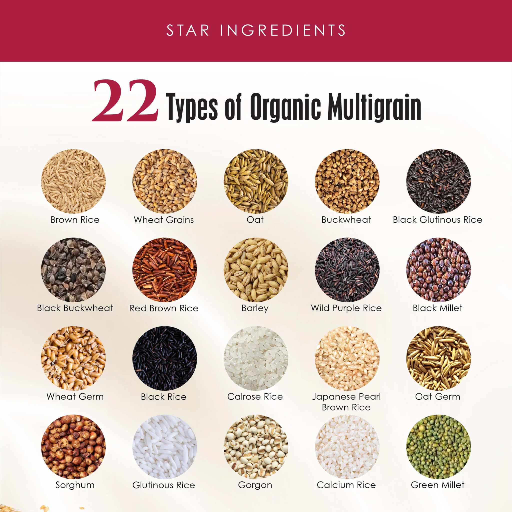 • Multigrains: A blend of 22 organic grains for essential nutrients and dietary fibre.
