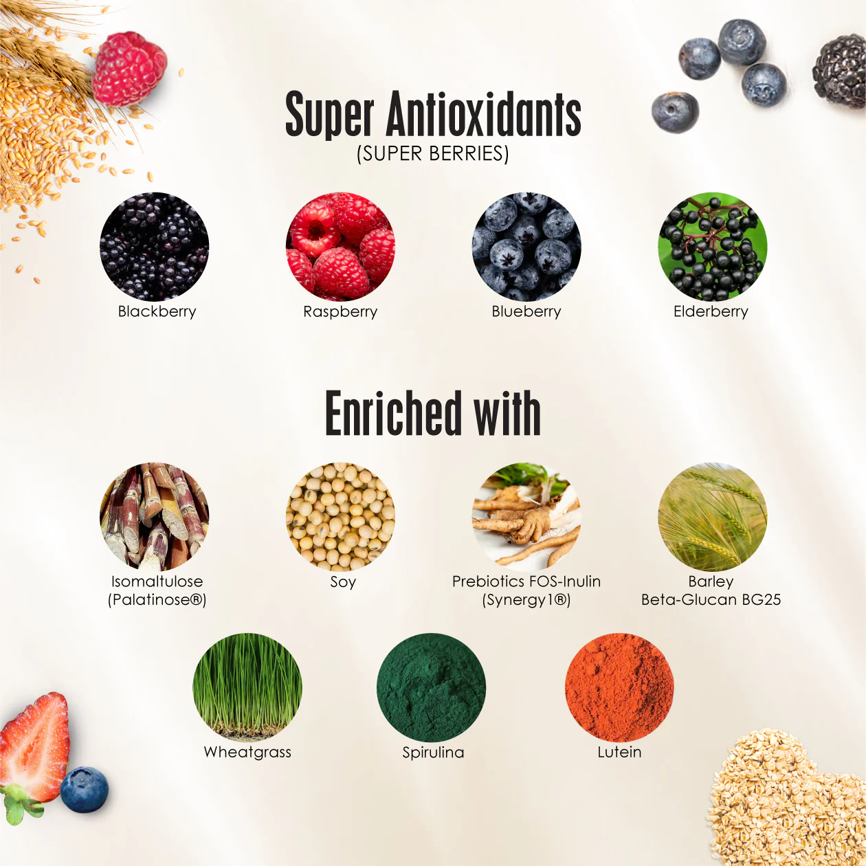 Ingredients: Multigrain Powder (Brown Rice, Wheat Grains, Oat, Buckwheat, Black Glutinous Rice, Black Buckwheat, Red Brown Rice, Barley, Wild Purple Rice, Black Millet, Wheat Germ, Black Rice, Calrose Rice, Japanese Pearl Brown Rice, Oat Germ, Sorghum, Glutinous Rice, Gorgon, Calcium Rice, Green Millet, Millet, Rice), Isomaltulose (Palatinose®), Soy, Prebiotics FOS-Inulin (Synergy1®), Barley Beta-Glucan BG25, Mixed Berries (Blackberry, Raspberry, Blueberry, Elderberry), Wheatgrass, Spirulina, Lutein.