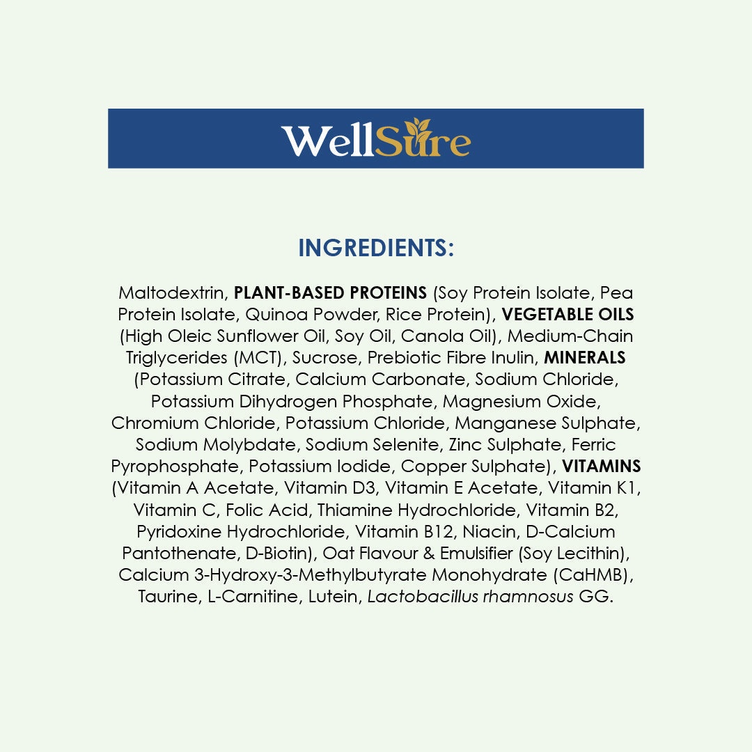 Maltodextrin, PLANT-BASED PROTEINS (Soy Protein Isolate, Pea Protein Isolate, Quinoa Powder, Rice Protein), VEGETABLE OILS (High Oleic Sunflower Oil, Soy Oil, Canola Oil), Medium-Chain Triglycerides (MCT), Sucrose, Prebiotic Fibre Inulin, MINERALS (Potassium Citrate, Calcium Carbonate, Sodium Chloride, Potassium Dihydrogen Phosphate, Magnesium Oxide, Chromium Chloride, Potassium Chloride, Manganese Sulphate, Sodium Molybdate, Sodium Selenite, Zinc Sulphate, Ferric Pyrophosphate, Potassium iodide, Copper Sulphate), VITAMINS (Vitamin A Acetate, Vitamin D3, Vitamin E Acetate, Vitamin K1, Vitamin C, Folic Acid, Thiamine Hydrochloride, Vitamin B2, Pyridoxine Hydrochloride, Vitamin B12, Niacin, D-Calcium Pantothenate, D-Biotin), Calcium 3-Hydroxy-3-Methylbutyrate Monohydrate (CaHMB), Oat Flavour & Emulsifier (Soy Lecithin), Taurine, L-Carnitine, Lutein, Lactobacillus rhamnosus GG.