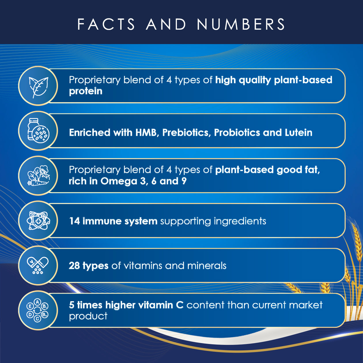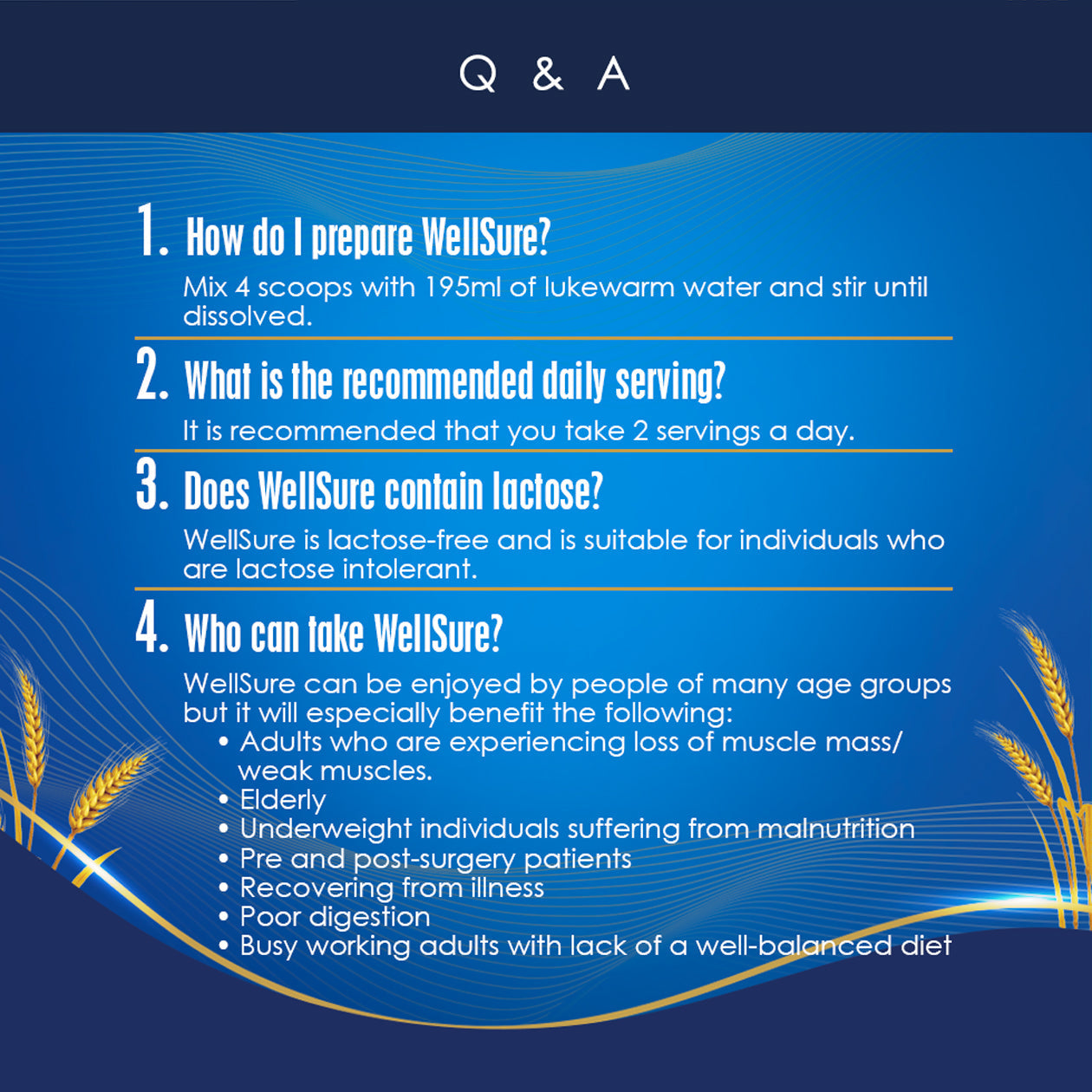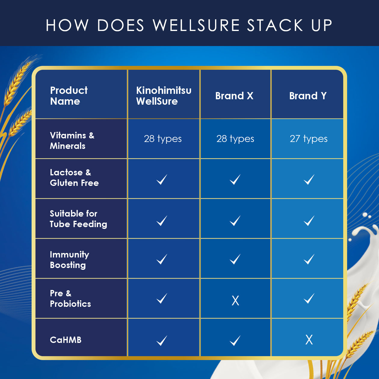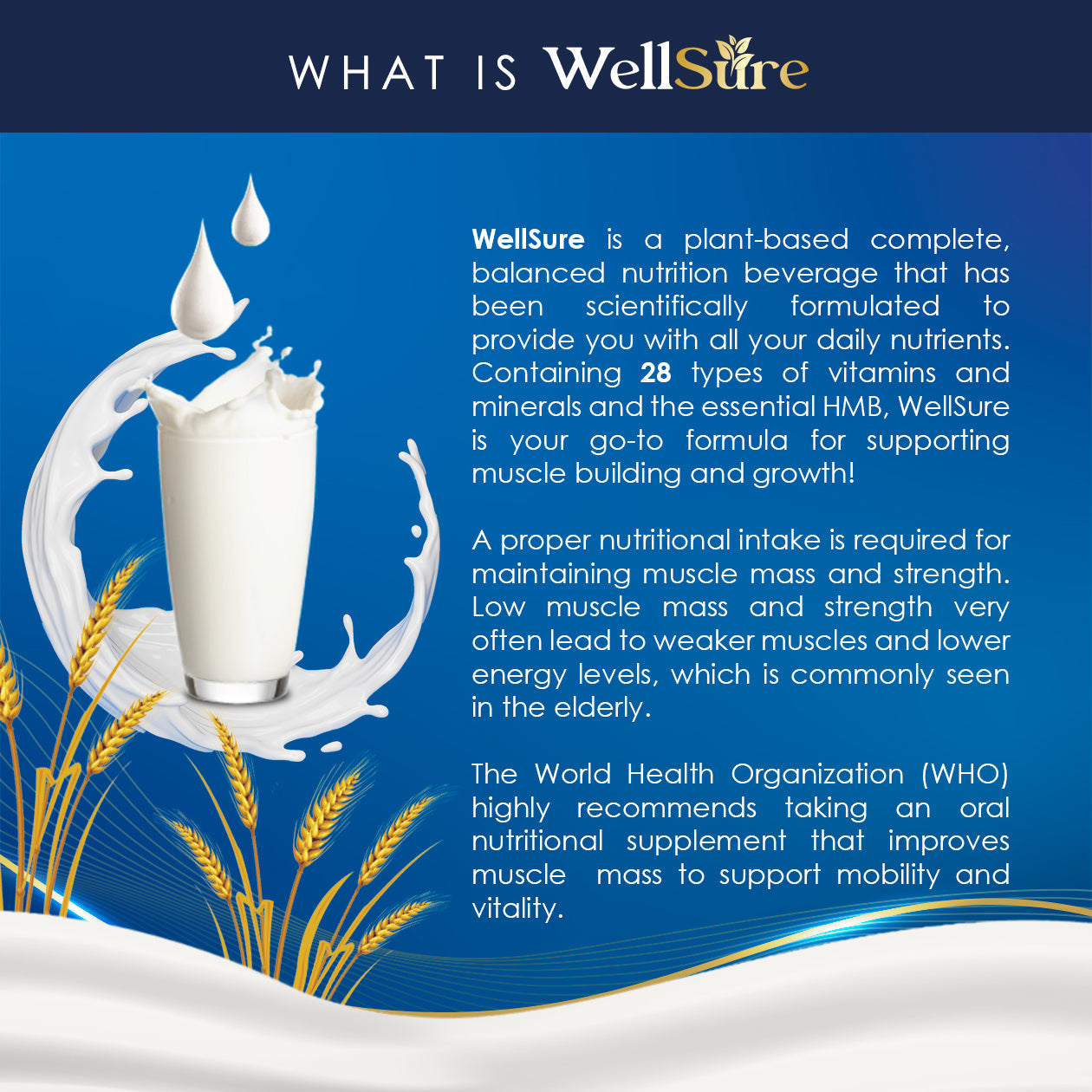 Kinohimitsu WellSure is specially formulated with plant-based proteins from Soy, Pea, Quinoa and Rice while enriching with HMB plus 28 types vitamins and minerals to build your nutritional foundation for an active lifestyle. It is a wholesome oral nutritional formula designed scientifically as dairy alternative to complete your daily meal nutrition need while providing you strength and vitality!