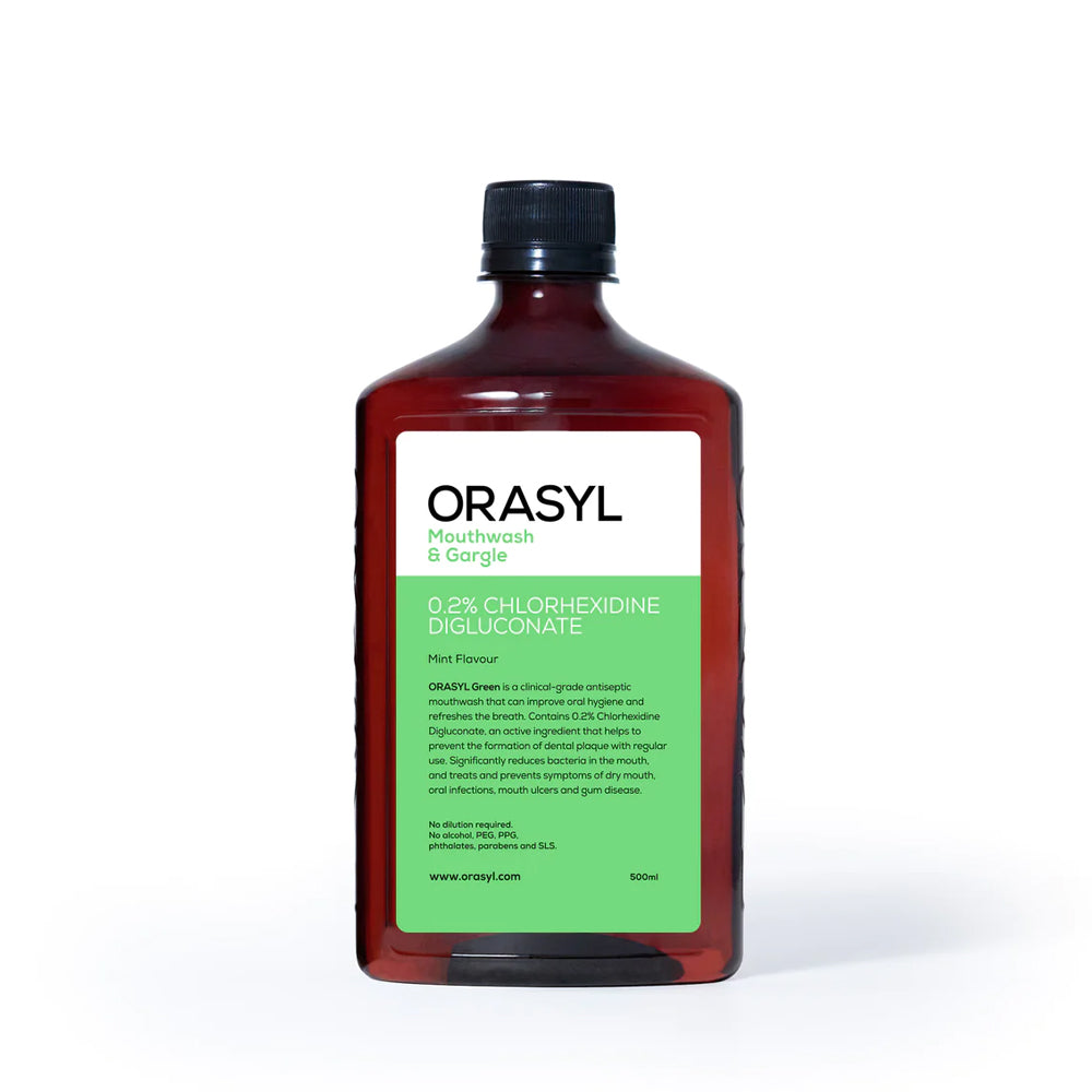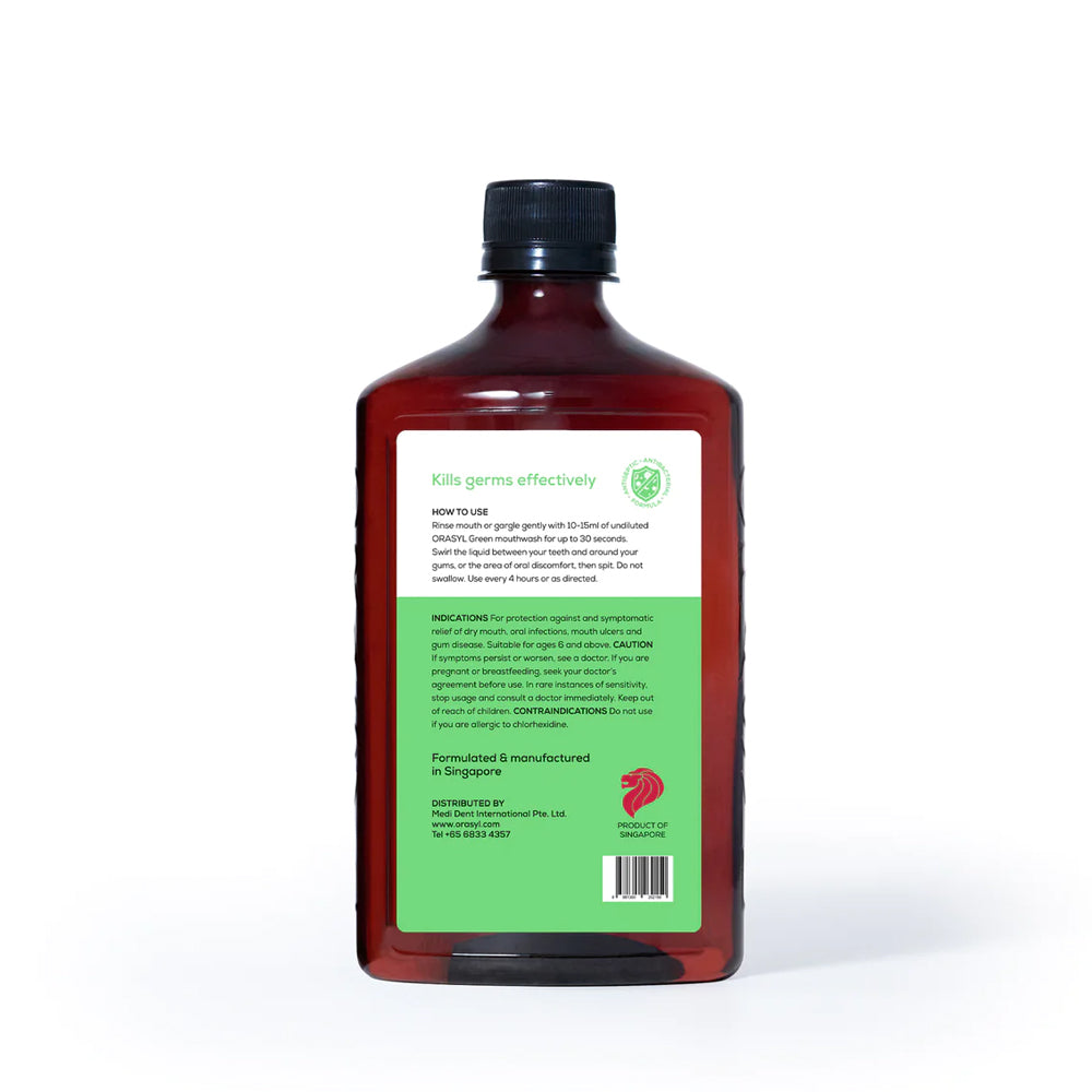 ORASYL Green - 0.2% Chlorhexidine Digluconate Mouthwash & Gargle. ORASYL Green is a clinical-grade antiseptic, germicidal mouthwash and gargle to help improve oral health with active ingredient 0.2% Chlorhexidine Digluconate. This active ingredient binds to negatively charged bacterial cell walls to affect the osmotic equilibrium of the cell to inactivate germs, viruses, and gram positive & negative bacteria. According to clinical studies, ORASYL Green reduces salivary bacterial load by 97% for 60mins at a time. It is used to commonly treat gum disease, ulcers and infection. ORASYL Green stabilizes mouth pH and reduces dry mouth syndrome.