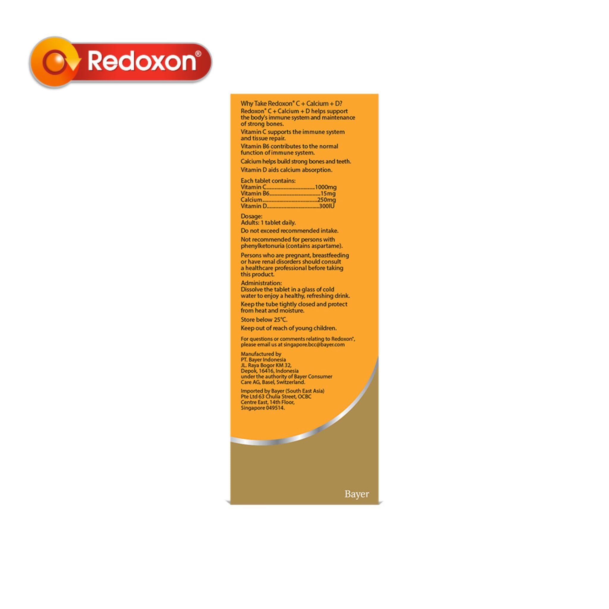 Redoxon C + Calcium + D helps support the body's immune system and maintenance of strong bones. Vitamin C supports the immune system and tissue repair., Vitamin B6 contributes to the normal function of immune system., Calcium helps build strong bones and teeth., Vitamin D aids calcium absorption.