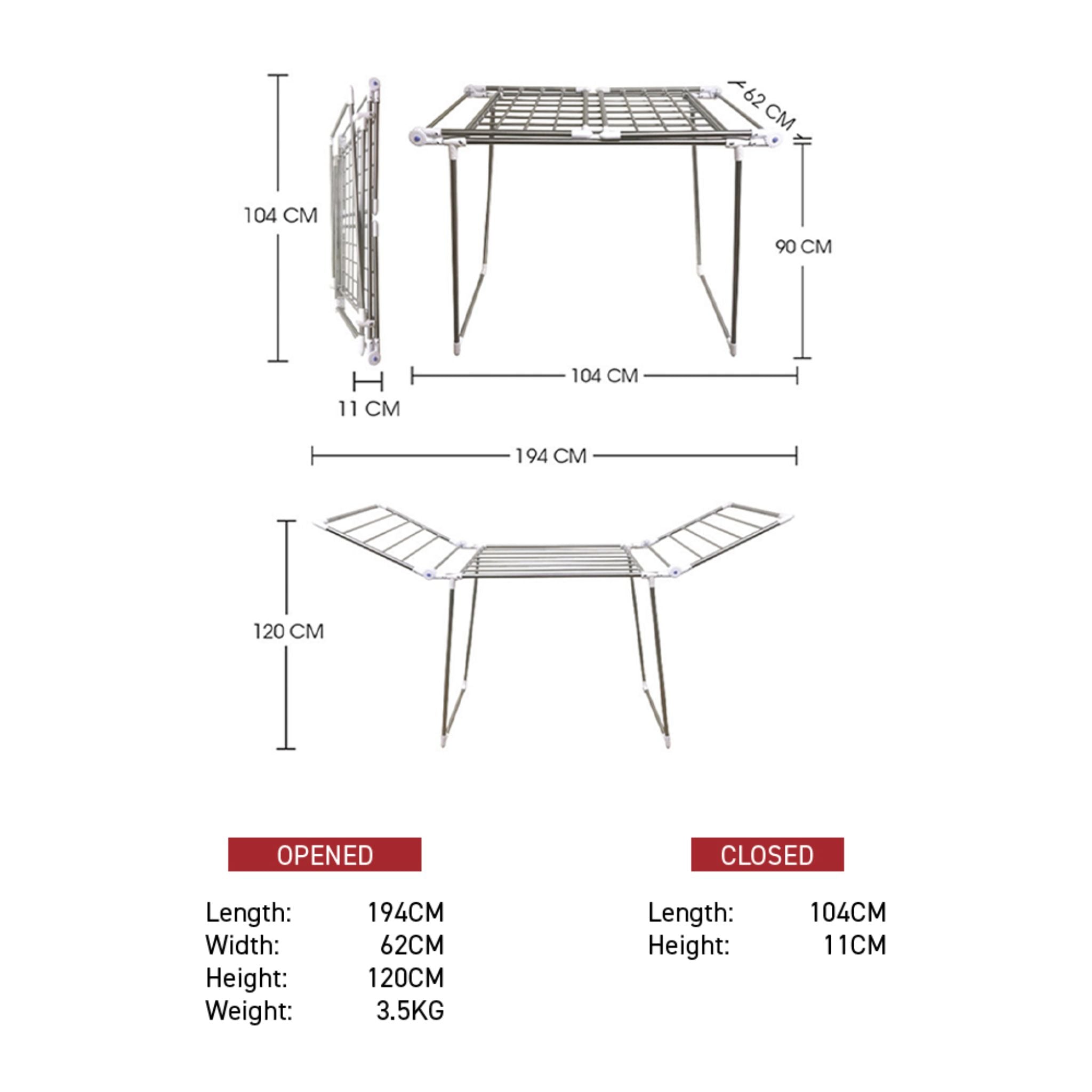 The Rene Odyssey Dryer is a wingtype dryer which weighs only 3.5kg. It can easily be move around wherever you need it to be. The dryer is made from Stainless Steel which makes it more durable as this material has a significant strength-to-weight advantage over other material options giving you a more durable dryer at a lighter weight. The highest point of the dryer is at 120cm which makes it suitable for long laundry items.