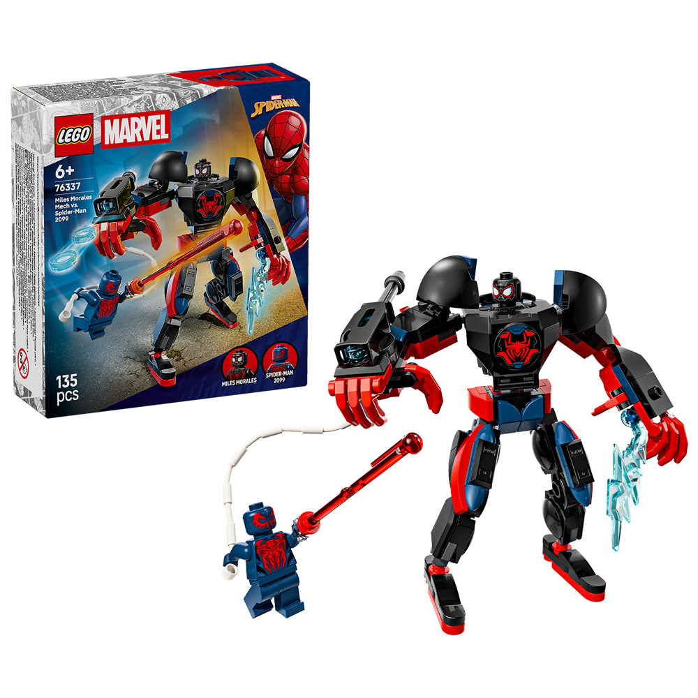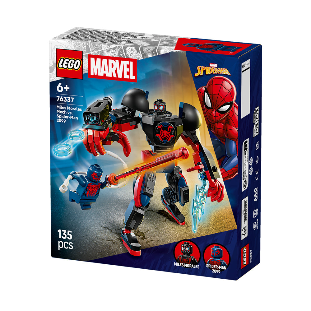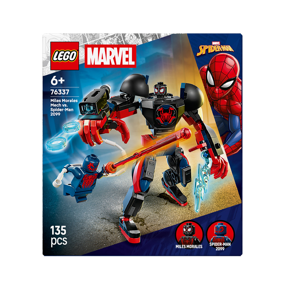 Bring supersized battle action from the Marvel movies to life with Miles Morales Mech vs. Spider-Man 2099 (76337), a Super Hero building toy gift for boys and girls ages 6 years old and up. This build-and-play kids’ toy will spark endless role play with a large, fully jointed mech, plus Spider-Man and Miles Morales minifigures.