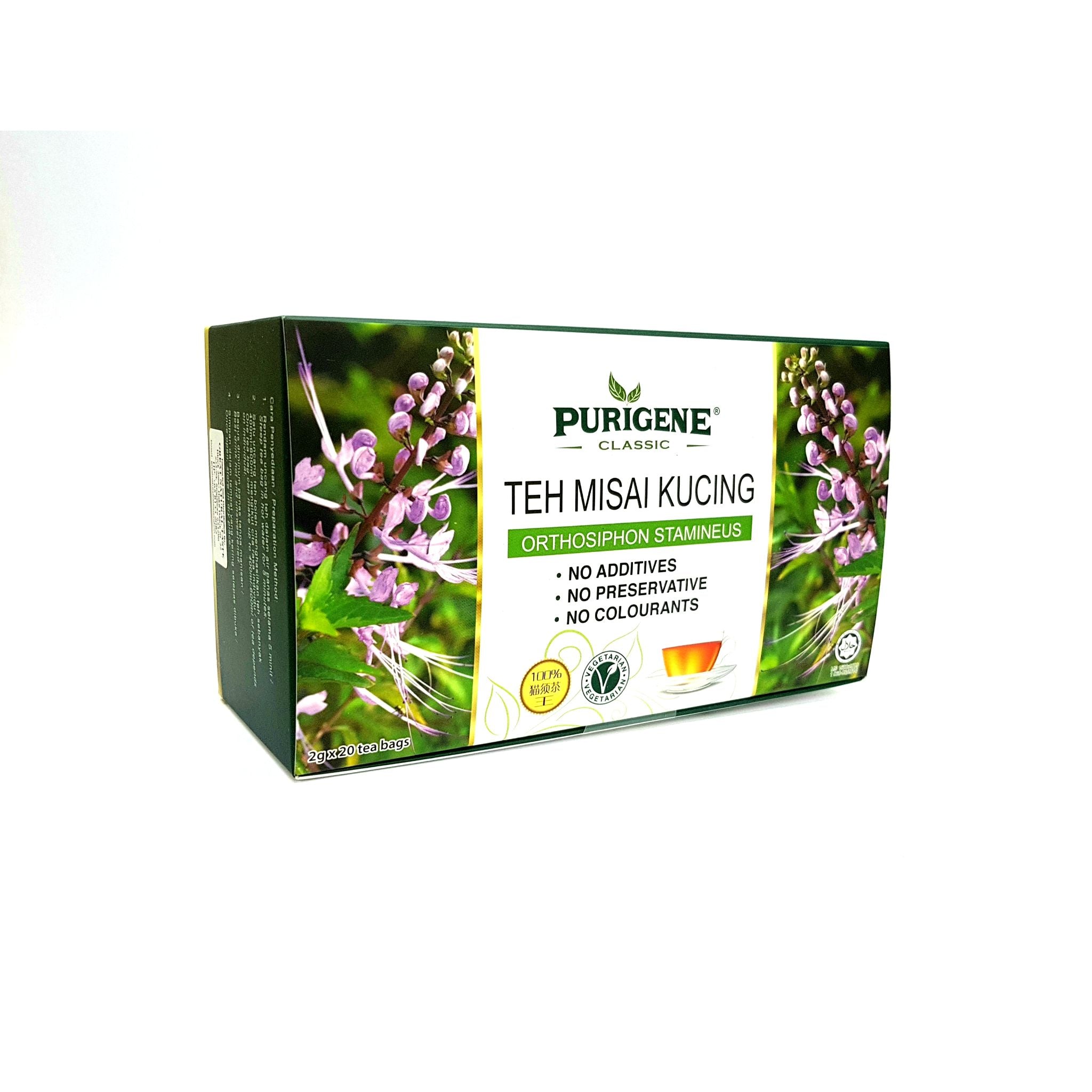 For generations, native communities in South East Asia have benefited from the goodness of Misai Kucing herbal tea. Tealeaf from the organic Purigene Misai Kucing Tea is blended with premium quality. Purigene Misai Kucing tea has a delightful aroma, refreshing and unique flavour. This product is certified chemical residue free.