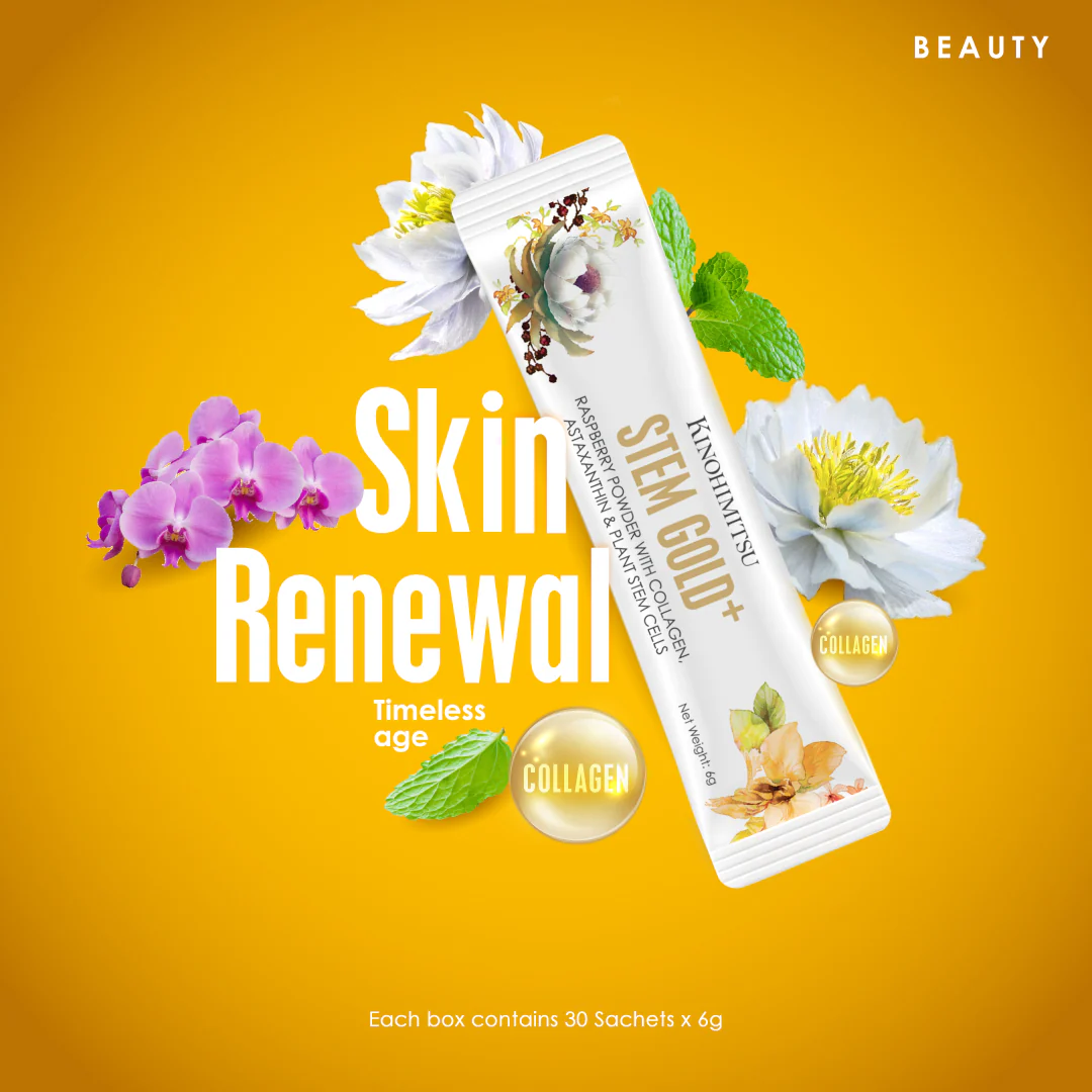 Ageing, sun exposure, and modern lifestyles can dull your skin. Kinohimitsu Stem Gold+ was created to revive youthful radiance by restoring hydration, firmness, and elasticity.