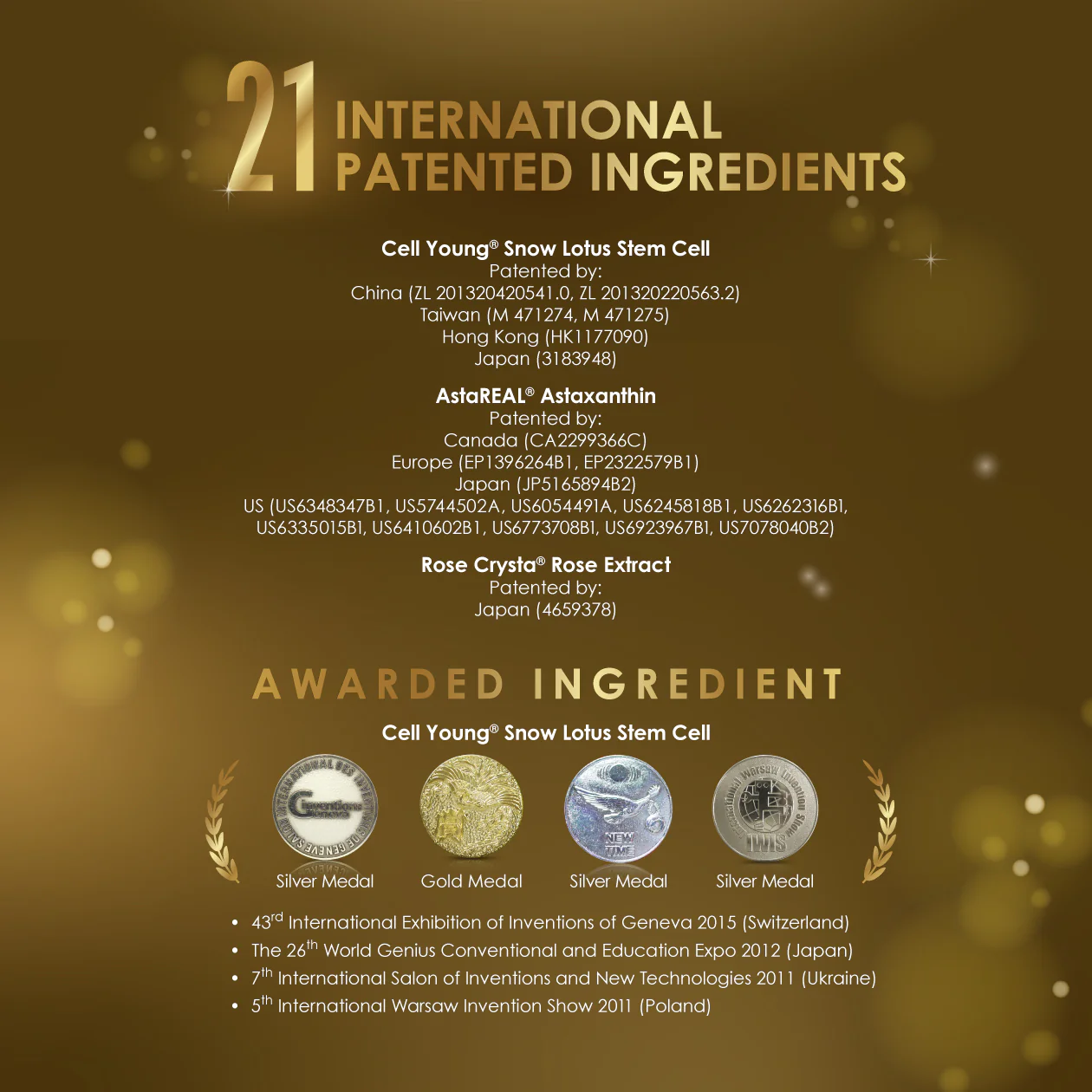Ingredients: Cell Young® Snow Lotus Stem Cell, Cell Young® Orchid Stem Cell, Marine Collagen Peptides, AstaREAL® Astaxanthin, Rose Crysta® Rose Extract, Beetroot, Pine Bark Extract, Lycopene.