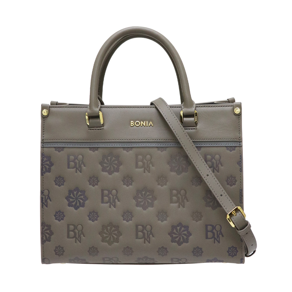 Bonia Monogram Debossed Leather Satchel Bag - Grey